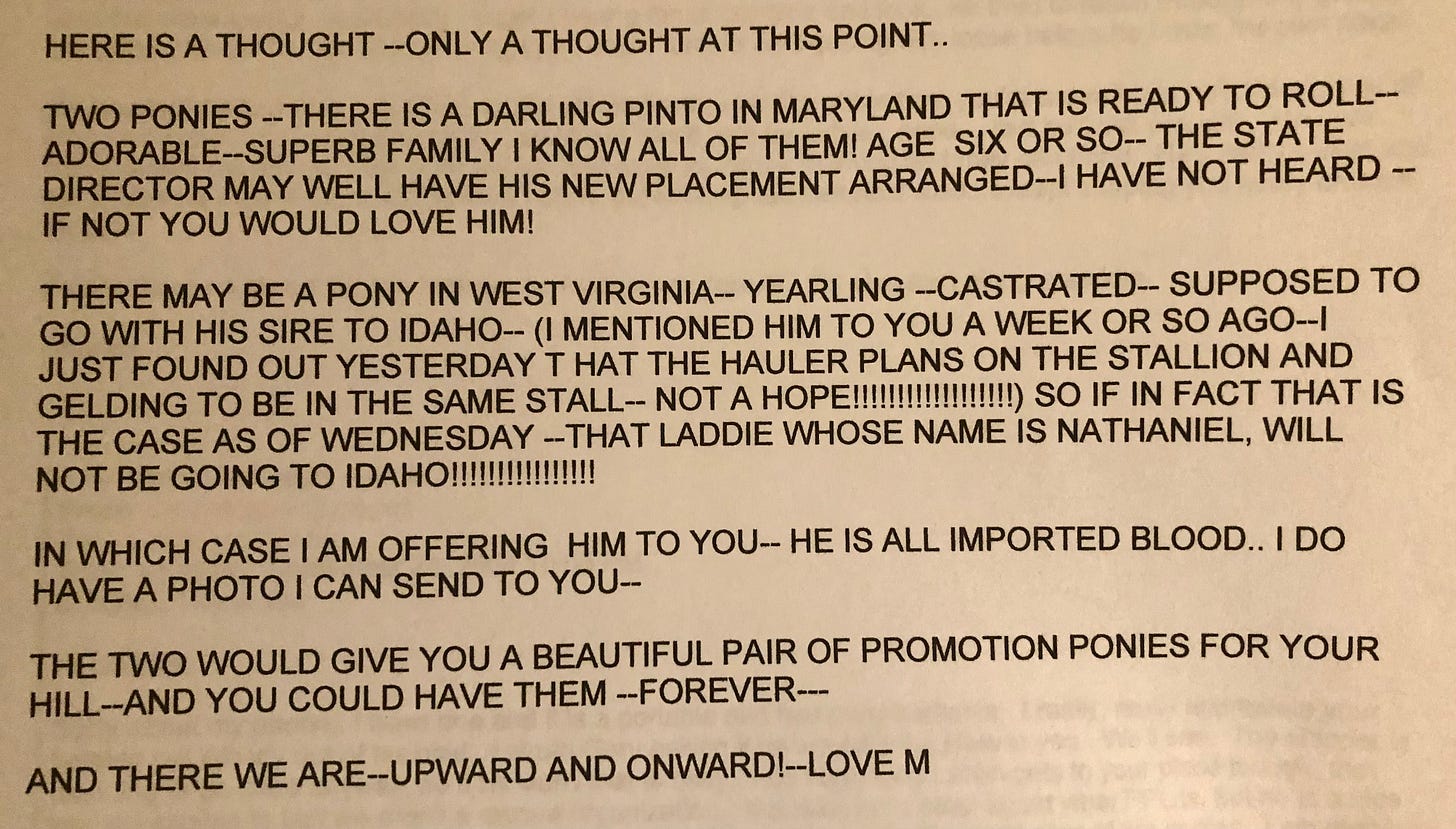 I printed off my emails back then if they seemed important. From Marianne Alexander, founder of Personal Ponies.