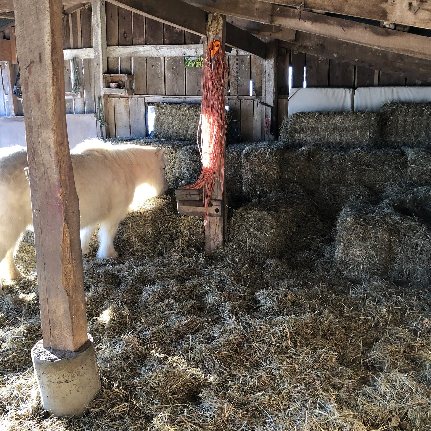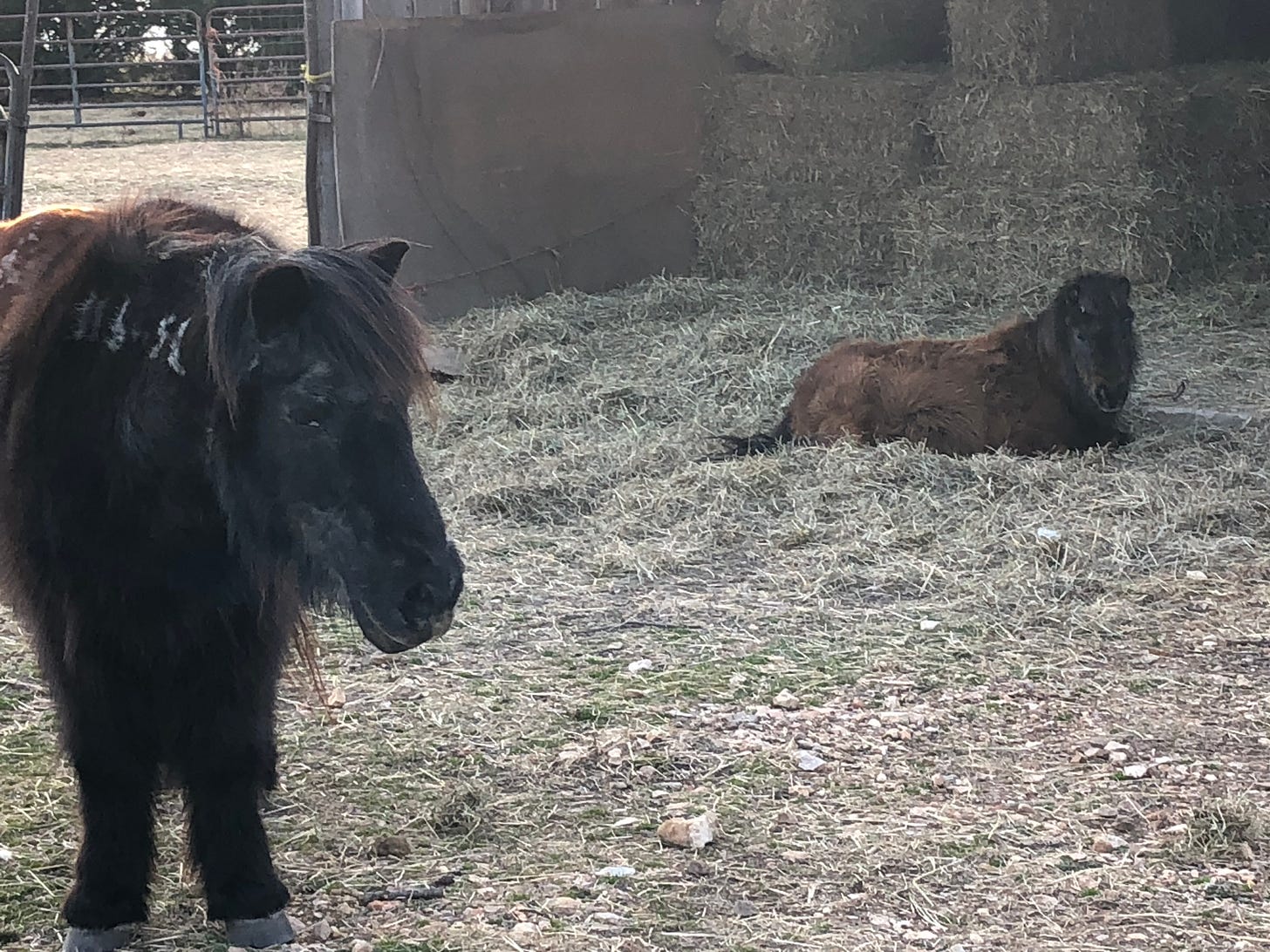 Rose and Angel before the storm. Fifty bales delivered and stacked in the pony barn.