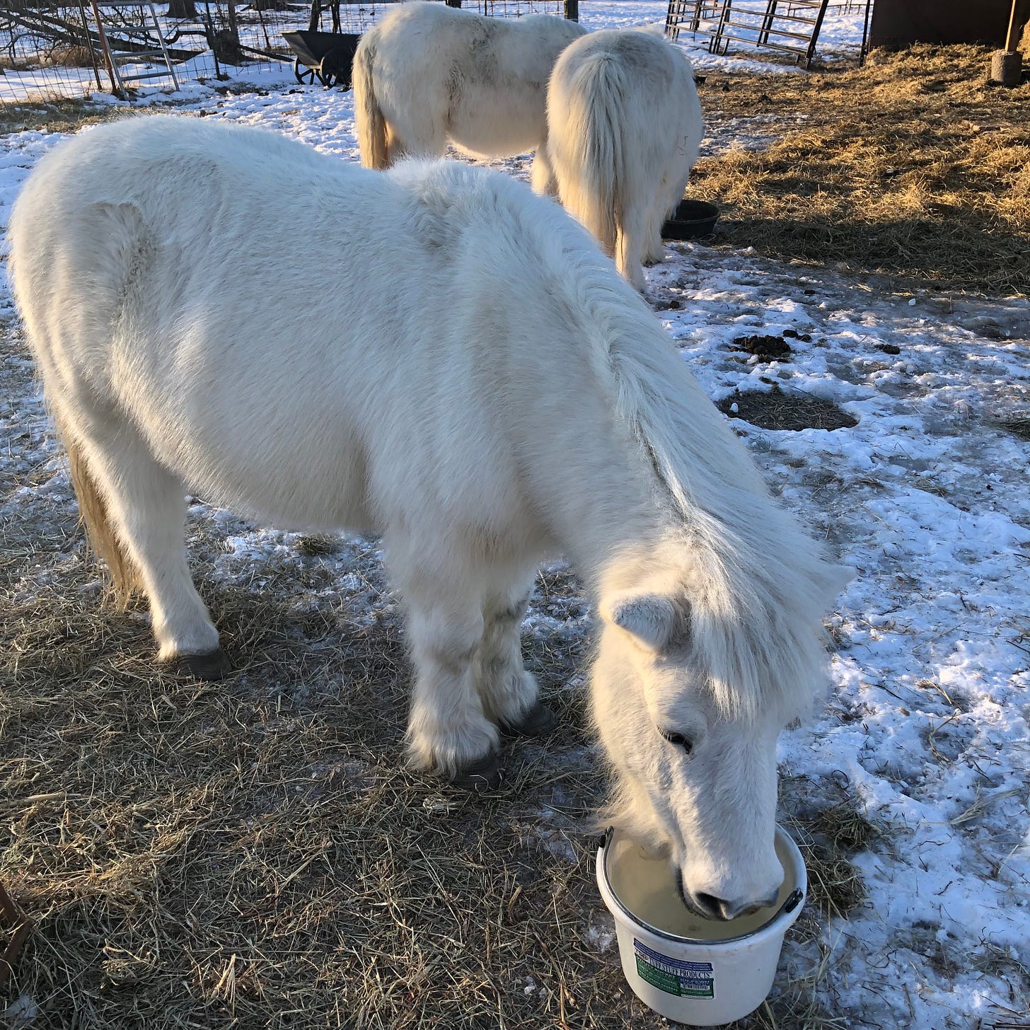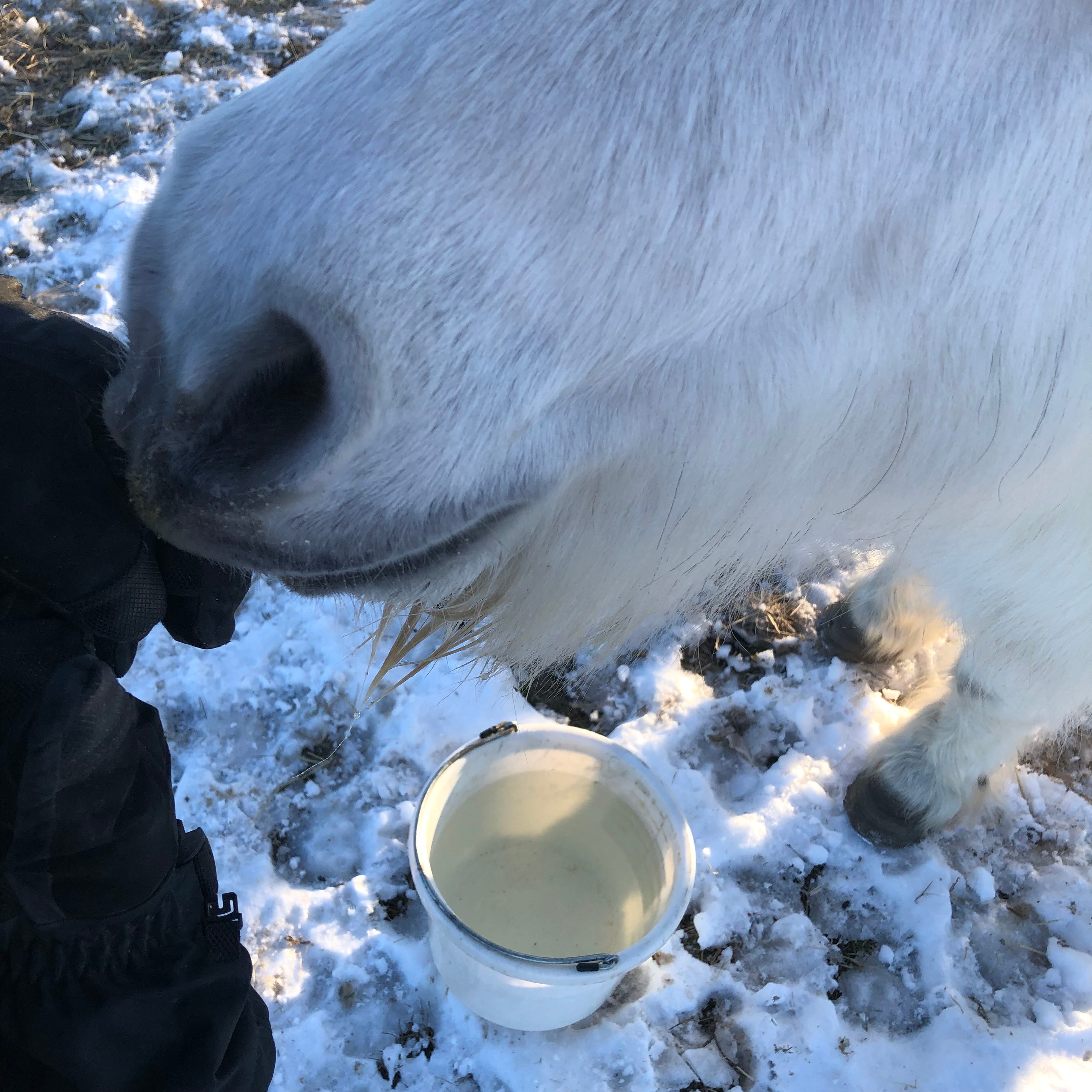 Nate having a drink of warm water. I offer it until there are no takers. They have tank heaters in the big troughs, but nothing like a hot drink, right?